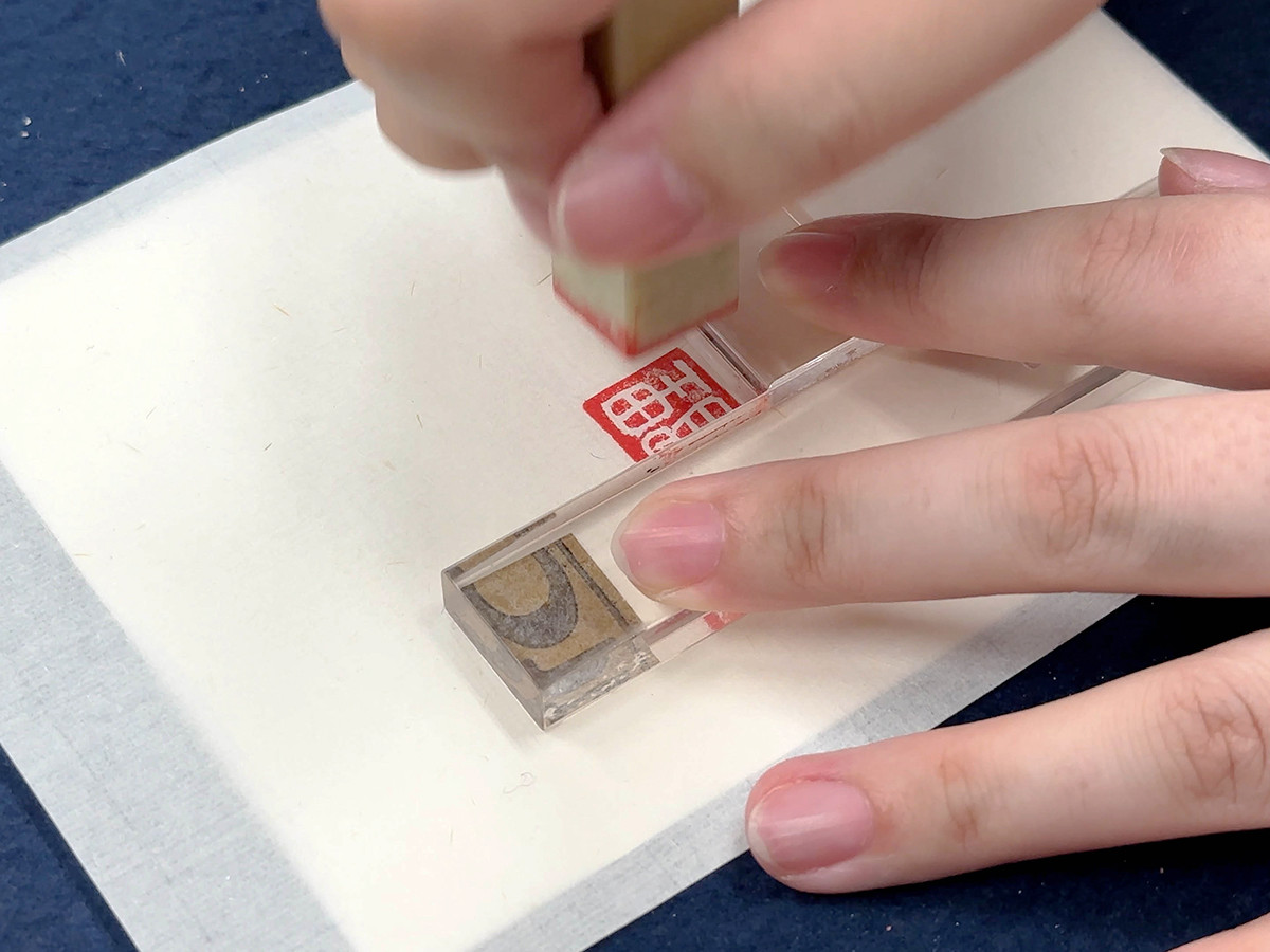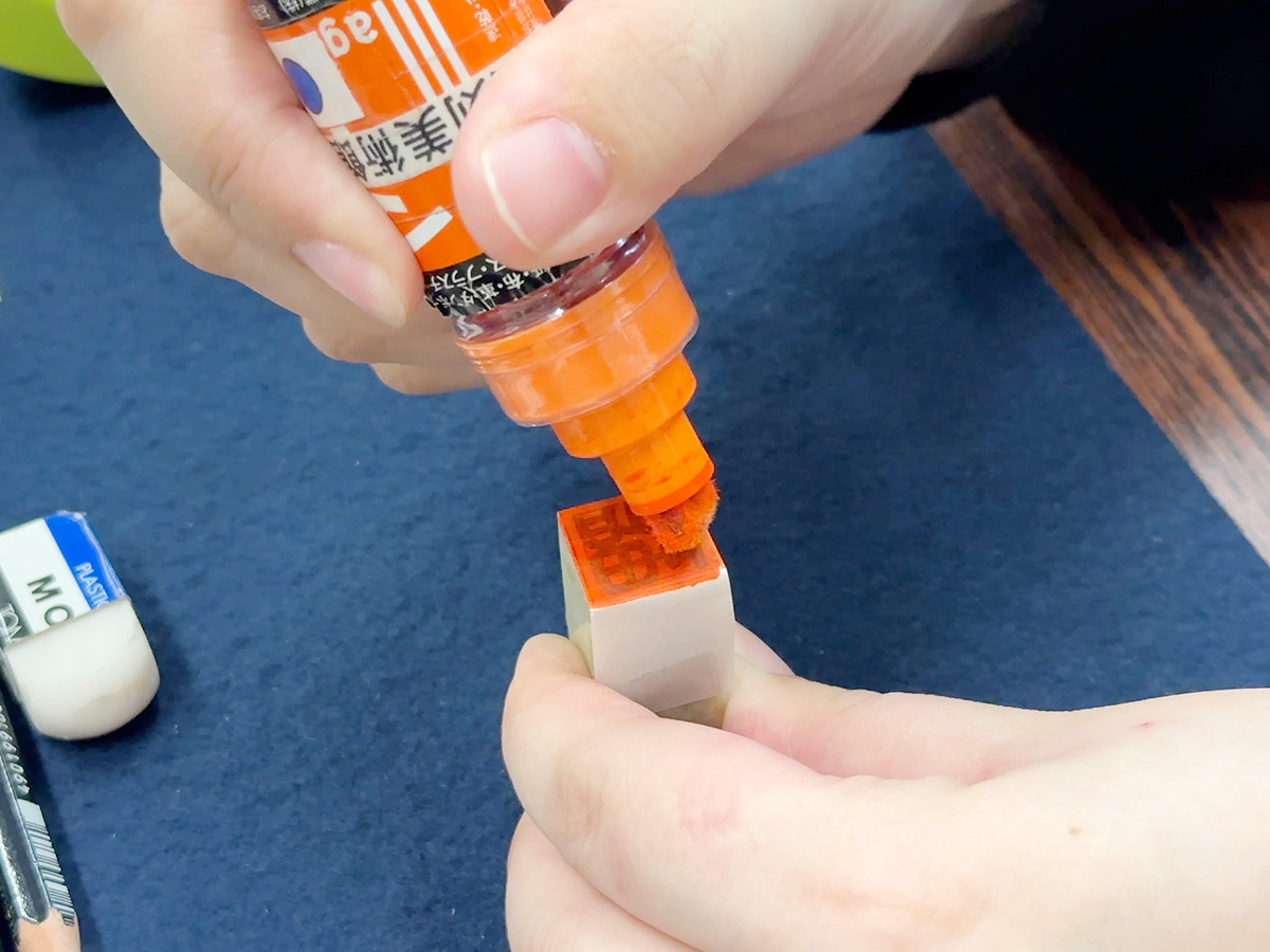 印矩(印を押すときの定規)で位置を決めて、篆刻用の朱肉である印泥をたっぷり付けて、印箋(印を押すための紙)にぐっと押すと…自分で作った世界にひとつだけの印、きっと感激すると思います。