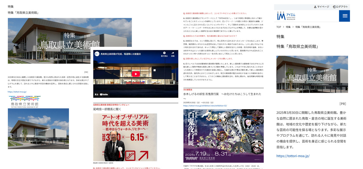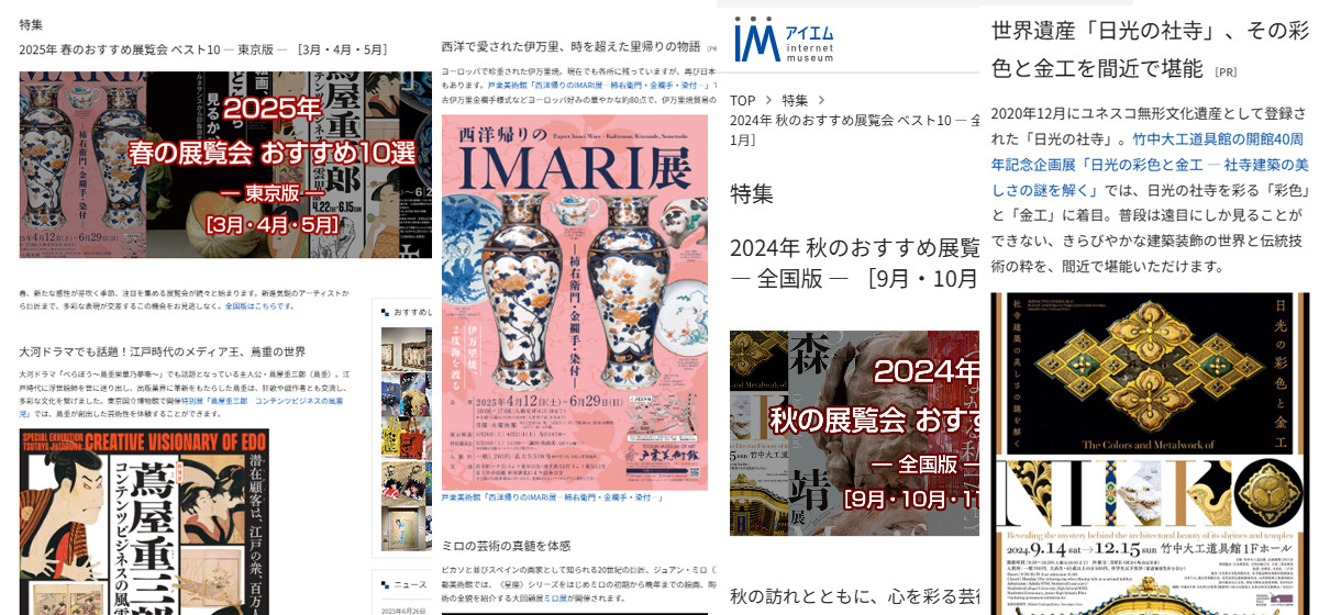 日本最大級のミュージアム情報サイト「アイエム」は、「Life with Museum(ミュージアムのある暮らし)」をコンセプトに掲げ、1996年の創設以来、全国の美術館・博物館の展覧会情報を紹介し続けてきました。インターネット黎明期から積み重ねてきた信頼と実績により、アートファンはもちろん、文化施設関係者にも広く認知されています。