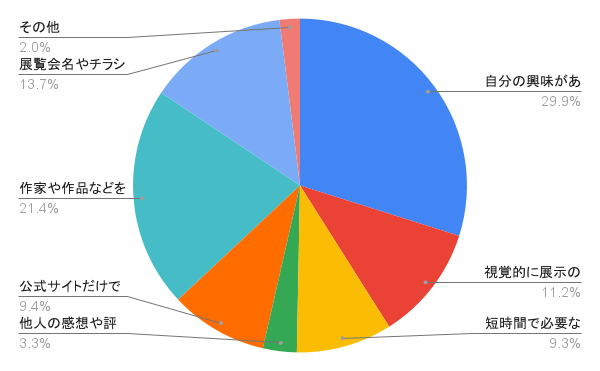 「自分の興味に合うか事前に判断したい」という理由が最も多く、訪問の失敗を避けたいという心理が強く働いています。また「事前に調べて理解を深めておきたい」という回答も多く、鑑賞の質を高めるための能動的な準備にネットが不可欠となっています。情報を精査して納得した上で効率よく楽しみたいという現代人の「タイパ」意識が、丁寧な下調べを後押ししているといえます。