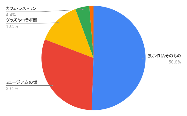 ミュージアムでの1人あたりのトータル支出額は、平均で約2,983円、中央値は3,000円となりました。最も多い価格帯は3,000円前後(30.9%)であり、次いで2,000円前後(30.1%)が続きます。全体の約6割の方が、1回の訪問で2,000円〜3,000円程度を費やしていることが分かります。